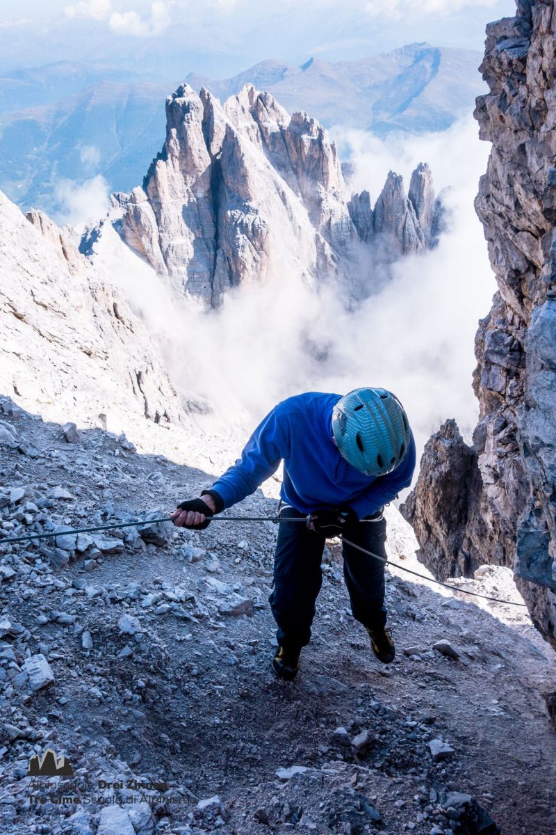 Der Elferkofel ist einer der imposantesten Berge der Sextner Dolomiten. Die Route auf den Südgipfels ist sehr vielfältig. Kletterstellen bis zum dritten Schwierigkeitsgrad wechseln sich mit landschaftlich eindrucksvollen Gehpassagen ab. Die Tour startet in der Zsigmondyhütte. Von dort wandert man in Richtung Hochbrunnerschneide ins Innere Loch, von welchem man über die Dezoltwand im zweiten und dritten Schwierigkeitsgrad auf den Zsigmondykopf hochklettert. Hier folgt man sehr imposant dem Grat, genau auf der Grenze zwischen Südtirol und Veneto, bis zum Mascabronibiwak. Von diesem steigt man verwinkelt über zwischen Türmen und über Felsbänder zum Gipfel auf. Die Route auf den Elfer ist konditionell sehr anspruchsvoll, deswegen empfiehlt es sich in der Zsigmondyhütte zu übernachten oder die Tour als Zweitagestour mit einer Übernachtung auf dem Mascabronibiwak zu planen. Ebenso ist eine sehr gute Trittsicherheit nötig, da auf den Gehpassagen viel Geröll liegt.
