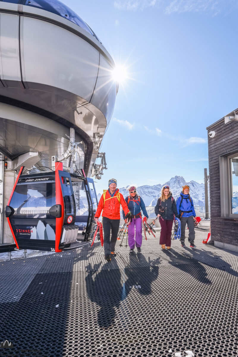 Nach Materialcheck und LVS- Kontrolle bei der Talstation der Dreizinnen Seilbahn fahren wir mit der Gondel zur Bergstation. Von dort führt uns die Wanderung über mäßig steile Hänge und meist unverspurten Schnee zum Gipfel. Die genaue Routenwahl wird von ihrem Bergführer der aktuellen Lawinensituation angepasst.